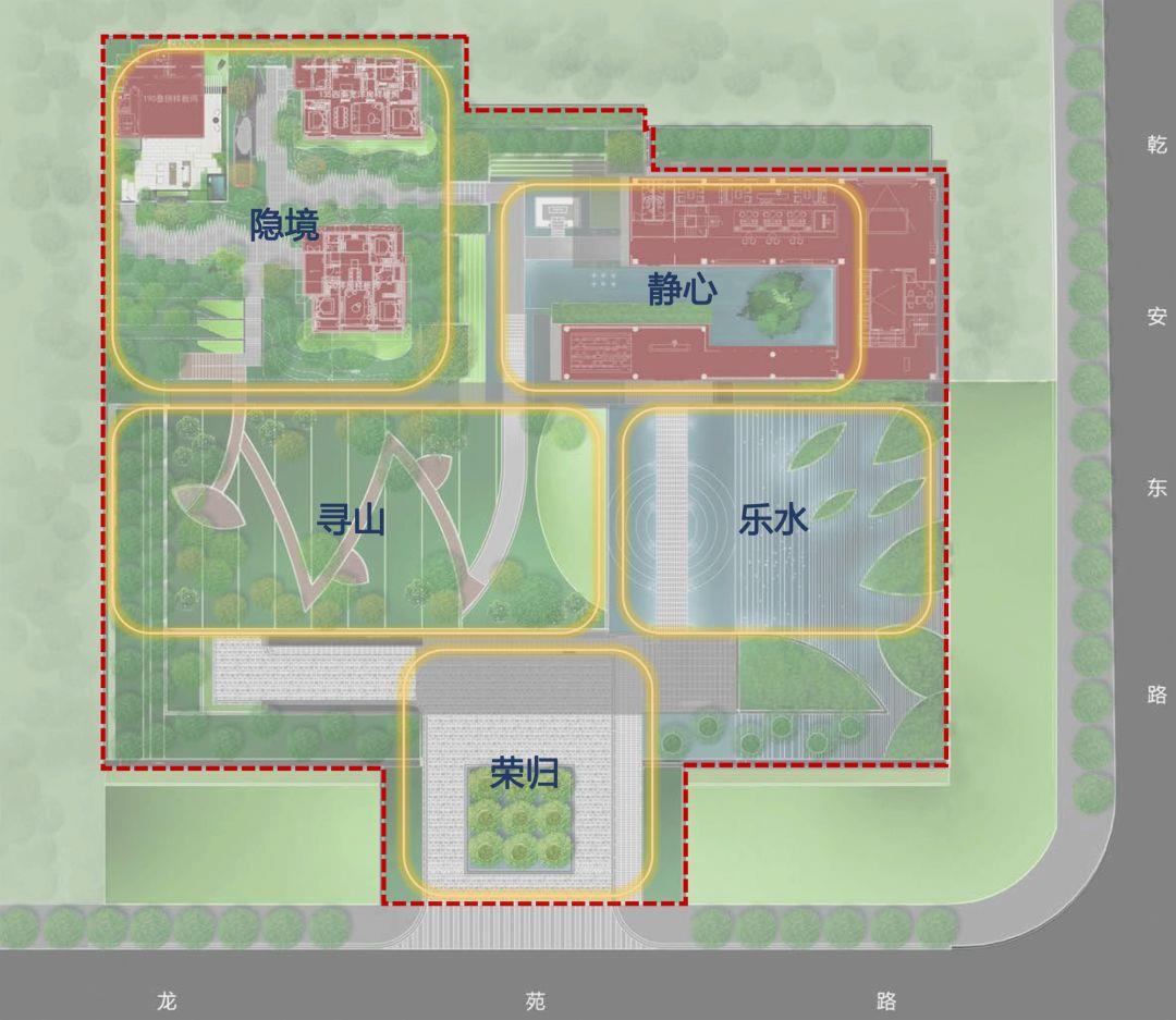 中建宸庐诗画园林示范区,采用景观递进和移步换景的设计手法,通过“荣归—乐水—静心—寻山—隐境”的有机动线,将王维的山水情怀贯穿其间,浓荫之下,屋脊隐现,曲径通幽,移步异景。
