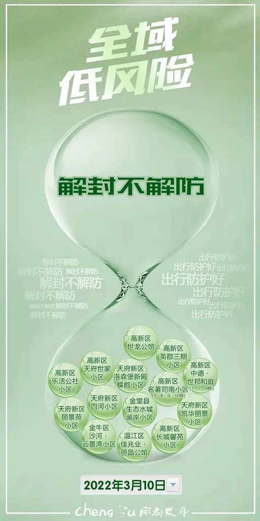 3月10日0时,成都此轮本土疫情最后三个中风险区:高新区名著司南小区7栋、8栋、9栋、10栋,乐活公社小区,英郡三期小区,正式解封。至此,成都全域实现低风险。