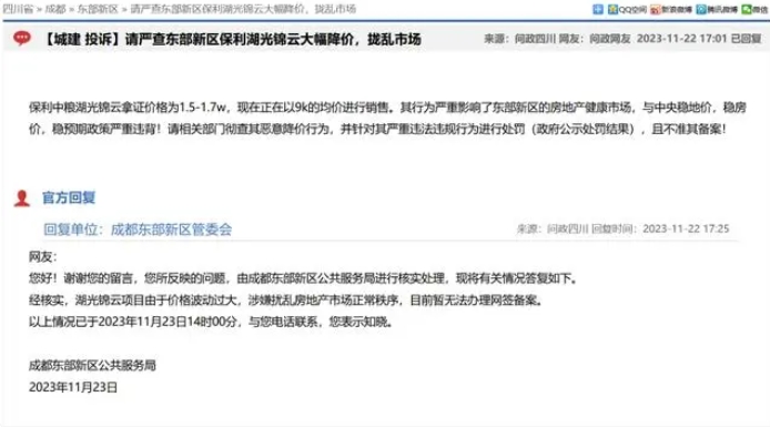 问政四川网站消息,11月22日、11月24日,均有网友投诉称,成都东部新区保利中粮湖光锦云项目“恶意降价扰乱市场”,项目拿证价格1.5万-1.7万元,现在以9000元均价销售,降幅达到40%以上。