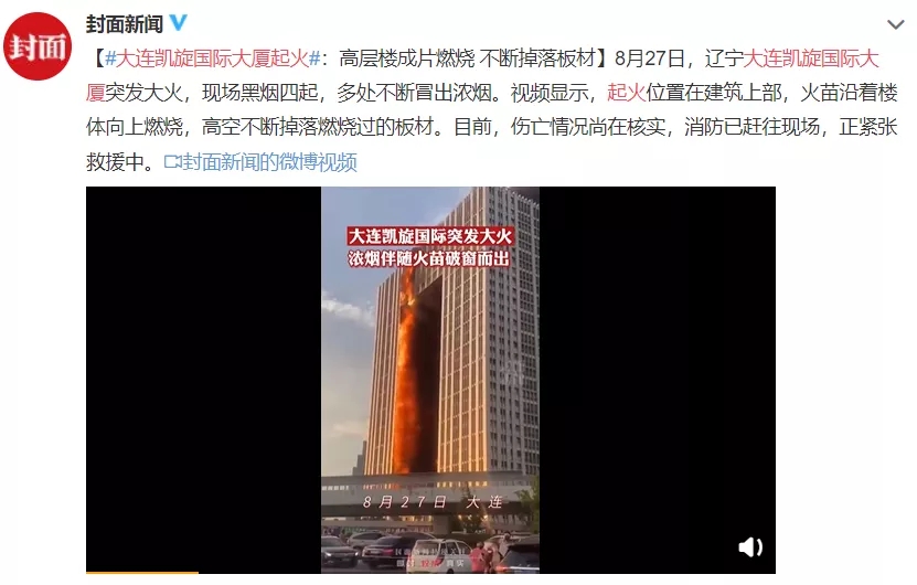 8月27日16时许,大连金普新区凯旋国际大厦发生火情。网上出现的多段视频显示,外型像一个“门”的凯旋国际大楼,从19楼开始起火,现场浓烟滚滚,火势吓人。历经7小时灭火,金普新区凯旋国际大厦火情明火被扑灭,所幸无人员伤亡。
